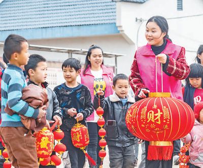 1月19日,湖南省道縣橫嶺瑤族鄉(xiāng)浪石村易地扶貧搬遷安置區(qū),工作人員和志愿者給安置區(qū)的小朋友送上新春裝飾品。蔣克青攝(影像中國(guó))