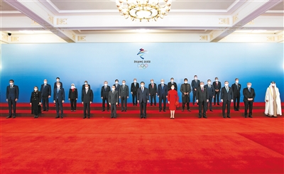 2月5日中午,國家主席習(xí)近平和夫人彭麗媛在北京人民大會堂金色大廳舉行宴會,歡迎出席北京2022年冬奧會開幕式的國際貴賓。這是習(xí)近平和彭麗媛同國際貴賓一起合影留念。