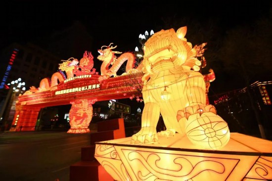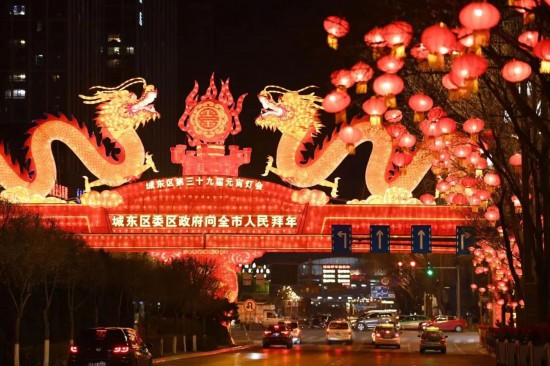 一盞燈點亮一座城,花燈作為重要的節(jié)日氛圍元素,寄托著無數(shù)人對年的記憶。今年,城東區(qū)搭建的龍門以“玉虎賀春盛世龍騰”為主題,寓意東區(qū)發(fā)展繁榮昌盛,人民生活幸福安康。龍門位于城東區(qū)建國南路新搭建的,高19.95米,跨度56米,寓意56個民族團(tuán)結(jié)一心,攜手共進(jìn),龍門整體造型為雙龍戲珠,大氣磅礴、寓意吉祥,形態(tài)生動的兩條巨龍富含深厚的文化底蘊(yùn)。