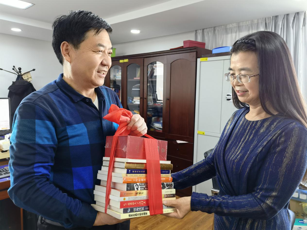 發(fā)放勞模小書屋圖書。韓世峰攝