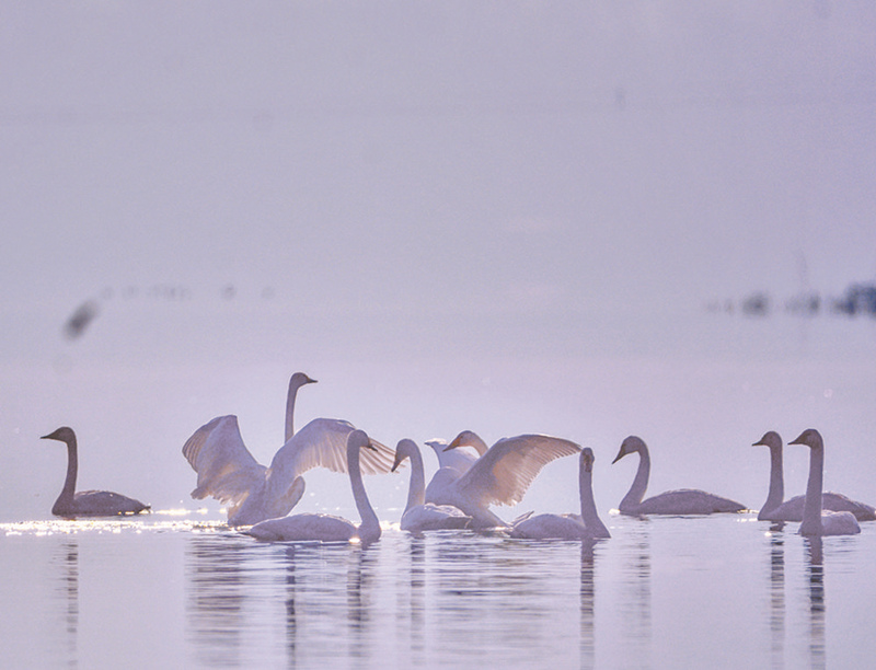 察覺到孩子醒了,爸爸媽媽也抬起頭環(huán)視四周,然后把另外兩個孩子叫醒,“別睡了,太陽出來該活動活動了,先跟我清清嗓子,啾啾……”周邊的大天鵝也一家家地精神起來,絡(luò)繹不絕的叫聲讓河面一下蘇醒過來,引得岸邊的攝影者們不停地按動快門。