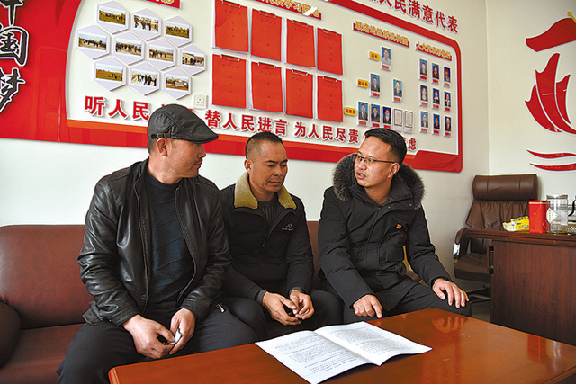 下胡丹村駐村第一書記楊俊德(右一)正在與村“兩委”班子成員商討宣講事宜。 通訊員 寧組 攝