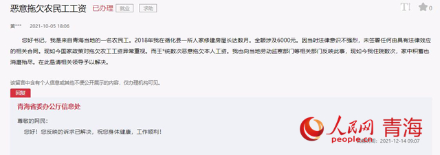 2021年10月,有網(wǎng)友通過人民網(wǎng)“領(lǐng)導(dǎo)留言板”向青海省委書記留言稱:2018年自己的父親在青海省循化縣為一戶人家修建房屋,但由于缺乏法律意識,未簽署勞動合同。事后雇主一直未支付6000元的酬勞。希望可以幫忙討回酬勞。