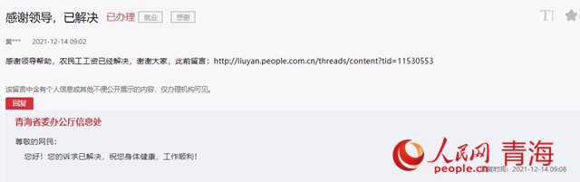 青海省委辦公廳收到留言后,第一時間對此事進(jìn)行核實(shí)與調(diào)查,并與留言人所在轄區(qū)法院聯(lián)系解決問題。在留言約一個月后,通過青海省海東市化隆縣人民法院的調(diào)解,黃女士一家拿到了這筆拖欠三年多的“救命錢”。