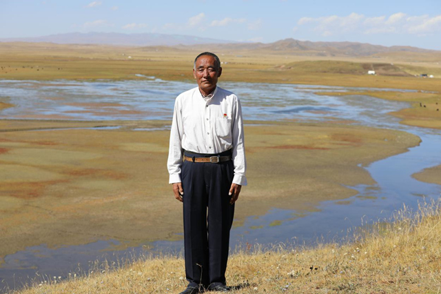 澤曲草原上,一個(gè)微駝的身影沿著濕地緩慢行走,他時(shí)而彎腰拾撿垃圾,時(shí)而舉著望遠(yuǎn)鏡看向湖心,22年從未間斷,F(xiàn)年69歲的多杰是青海省黃南藏族自治州澤庫縣多禾茂鄉(xiāng)秀恰村的原黨支部書記,同時(shí)也是澤庫縣環(huán)保志愿者,有著44年的黨齡。他守護(hù)的地方叫金灘鳥島,地處澤庫縣秀恰村,是澤曲草原上的一片鳥類棲息地。金灘鳥島四面被澤曲河水包圍,周邊分布著沼澤地和大片濕地草甸,島上生活著黑頸鶴、黑鸛、灰雁等國(guó)家級(jí)保護(hù)鳥類。遠(yuǎn)遠(yuǎn)望去,碧水呈奇,百鳥千姿,自然風(fēng)光旖旎,如同一幅絕佳的風(fēng)景畫。