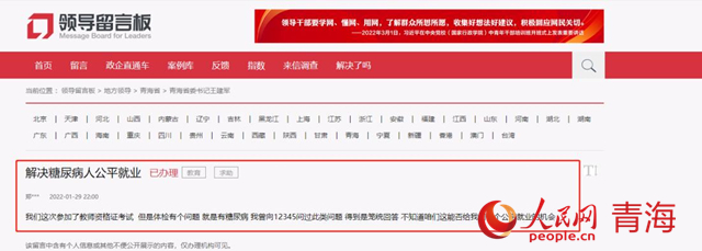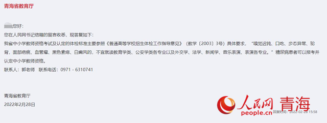 收到留言后,青海省教育廳核實(shí)情況并向該網(wǎng)友反饋,“糖尿病患者可以報(bào)考并認(rèn)定中小學(xué)教師資格。”
