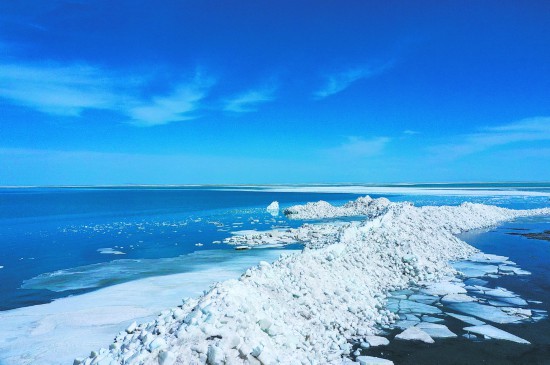 青海湖岸邊的湖冰(無人機(jī)照片)。新華社記者 張龍攝
