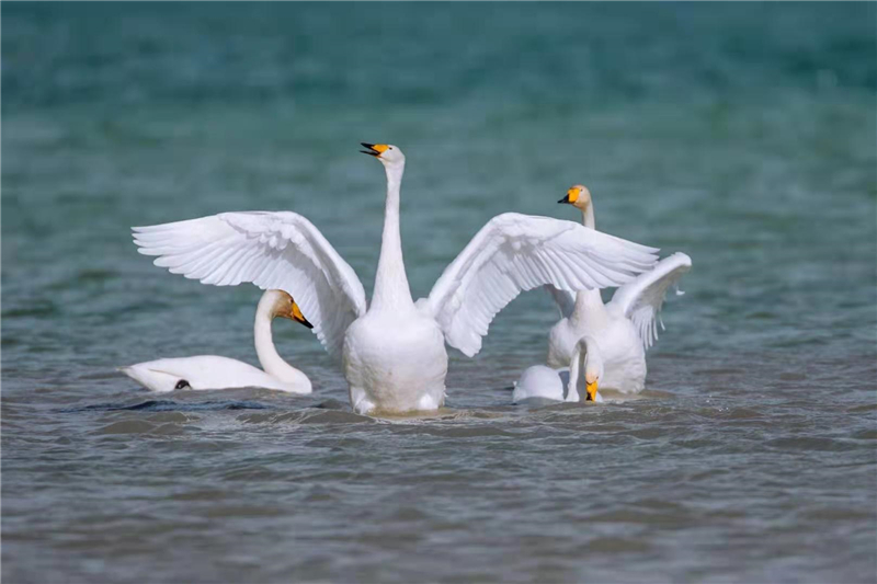 大天鵝在可魯克湖嬉戲。戴永峰攝