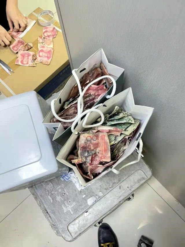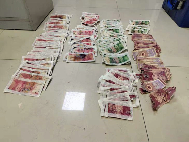 根據(jù)殘缺污損人民幣兌換的相關(guān)規(guī)定,銀行工作人員按照程序分離后的鈔票要鑒定真?zhèn),但發(fā)霉了的錢,濕潤黏稠,放進(jìn)驗(yàn)鈔機(jī)后,機(jī)器會發(fā)出警報聲,工作人員又找來吹風(fēng)機(jī),吹干以后每一張還要反復(fù)過很多遍機(jī)器。分揀、拼接、比對……經(jīng)過近8小時工作,工作人員最終清點(diǎn)兌換出10304.5元人民幣。