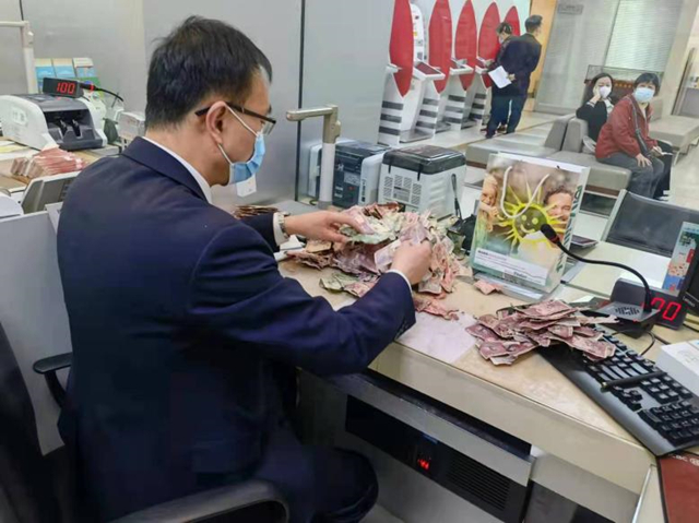 銀行工作人員使用專用工具拼接處理后的錢。中國工商銀行西寧黃河路支行供圖