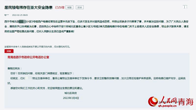 3月4日,西寧市城北區(qū)政府回復(fù)稱:經(jīng)核實,已對該小區(qū)物業(yè)及維保單位,景岳公寓物業(yè)及維保單位下發(fā)指令書,要求立即整改故障問題,加大日常巡檢維護保養(yǎng)頻率。目前電梯已維護完畢,運轉(zhuǎn)良好。