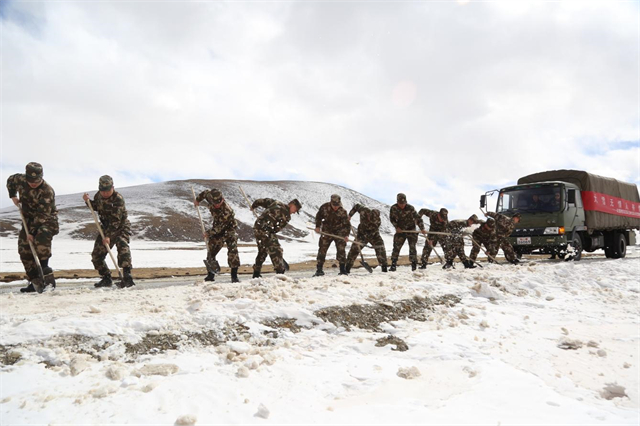 武警官兵參與抗雪救災。武警青?傟犛駱渲ш牴﹫D