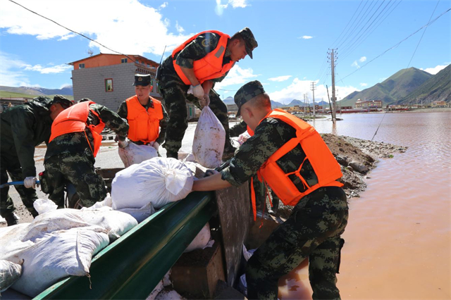 武警官兵參與抗洪搶險。武警青?傟犛駱渲ш牴﹫D
