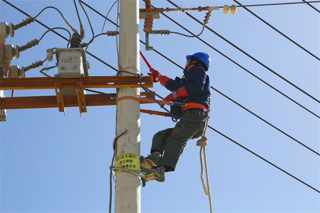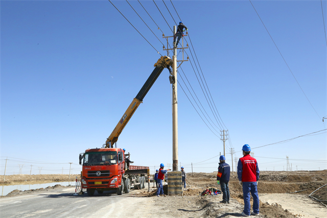 青海海西供電公司員工在10千伏區(qū)七路15號(hào)桿更換桿塔組件。國網(wǎng)青海省電力公司供圖