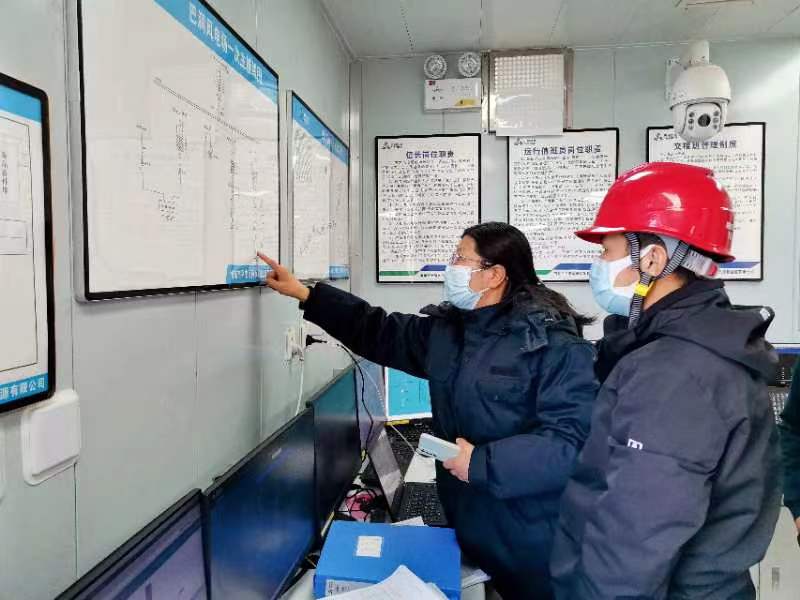 4月11日,國(guó)網(wǎng)海東供電公司調(diào)控中心員工宋雪芹、陳單洋在巴潤(rùn)風(fēng)電場(chǎng)為用戶檢查接線圖規(guī)范性。嚴(yán)福強(qiáng) 攝