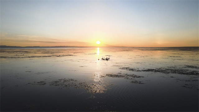 晨光下青海湖邊棲息的候鳥。剛察縣融媒體中心供圖