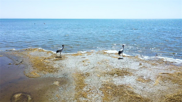 黑頸鶴在青海湖邊。剛察縣融媒體中心供圖