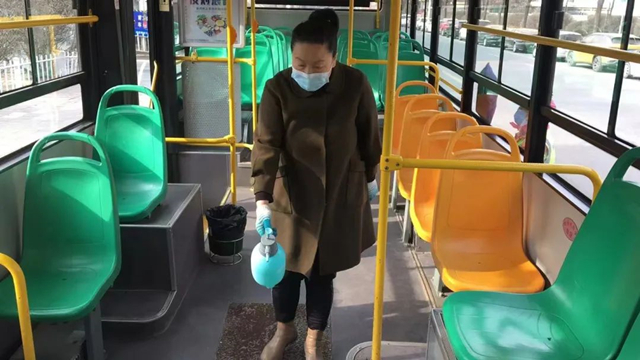 馬金蓮正在為車輛消毒。西寧公交公司供圖