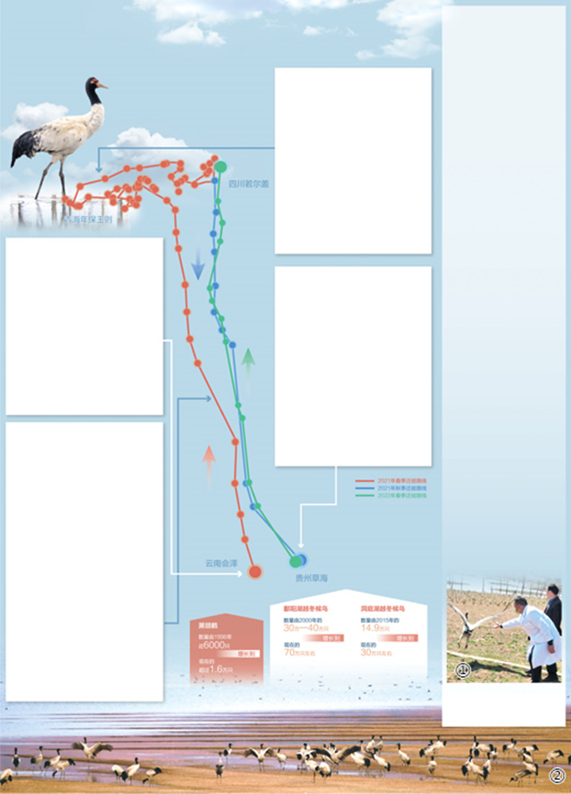 圖①:2021年3月,云南會澤黑頸鶴國家級自然保護區(qū)大橋片區(qū)的工作人員放飛被救助的黑頸鶴“V021”。資料圖片