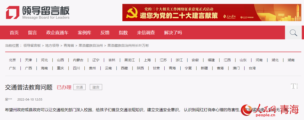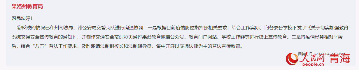 點擊查看留言詳情>>>人民建議|交通安全知識進校園 青海果洛:已安排