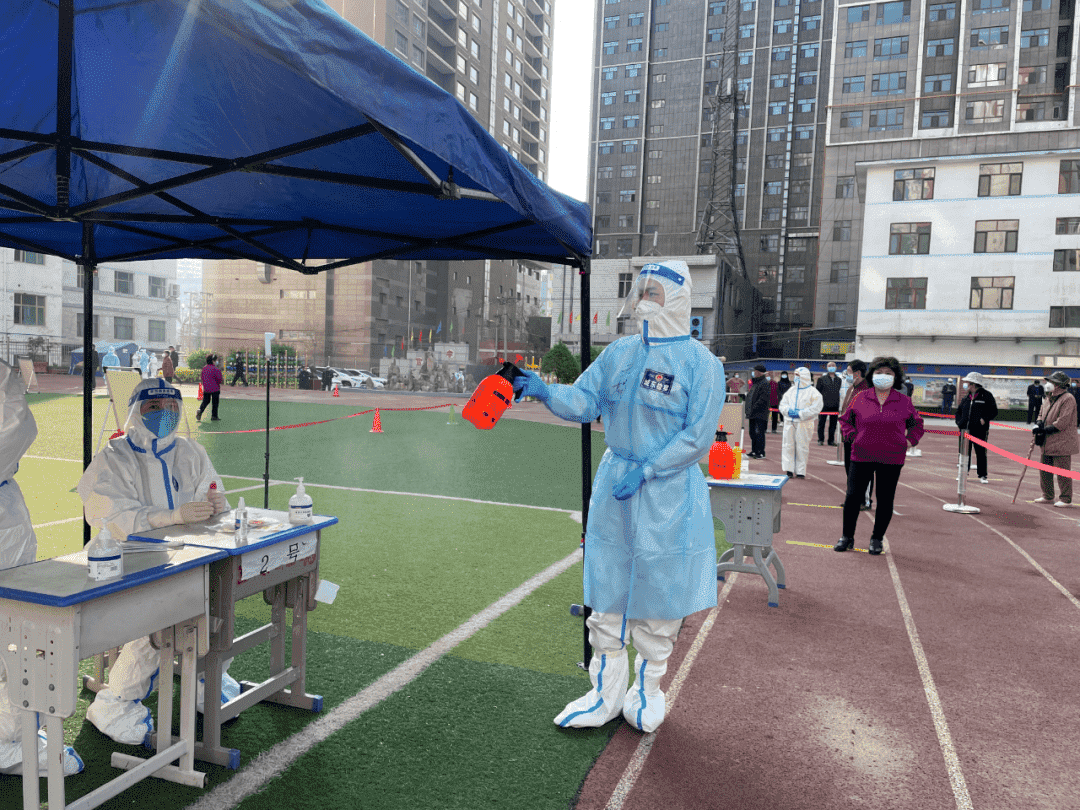 核酸采樣點消殺工作。城東區(qū)委宣傳部供圖