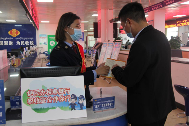 青海省黃南州辦稅服務(wù)廳專崗宣傳稅費(fèi)政策。黃龍攝