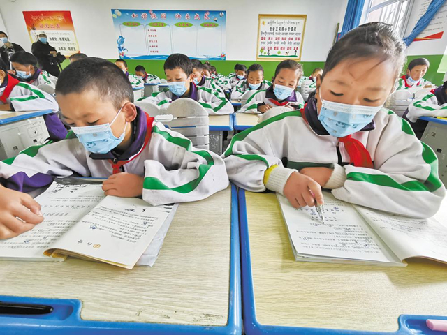 2021年“5·22”瑪多地震后,當(dāng)?shù)匾宰羁焖俣葟?fù)課復(fù)學(xué),圖為瑪多縣小學(xué)學(xué)生正在上課。李興發(fā)攝