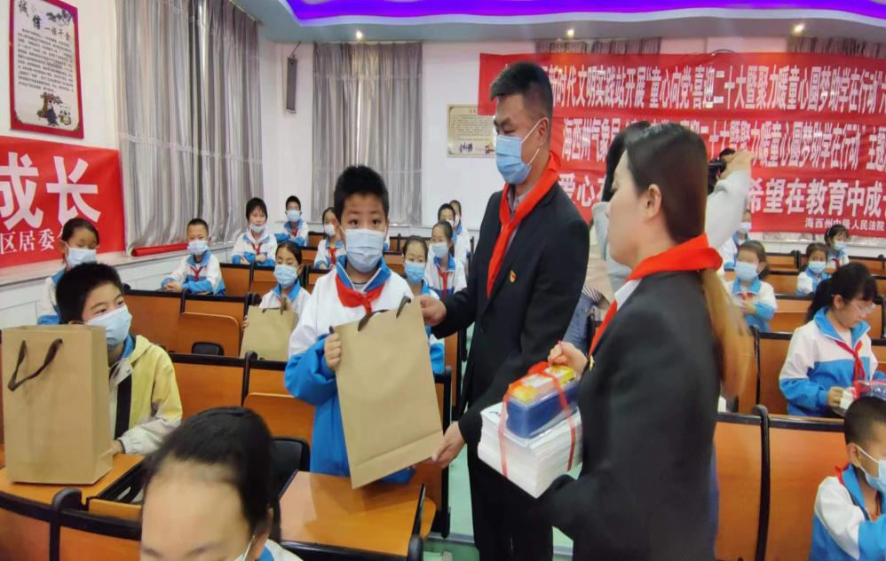 黨員給孩子們發(fā)放學(xué)習(xí)用品。海西州煙草局供圖