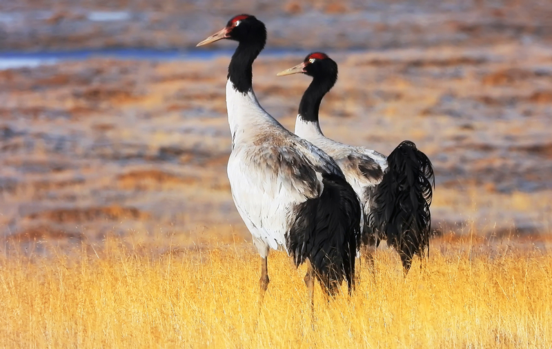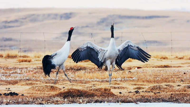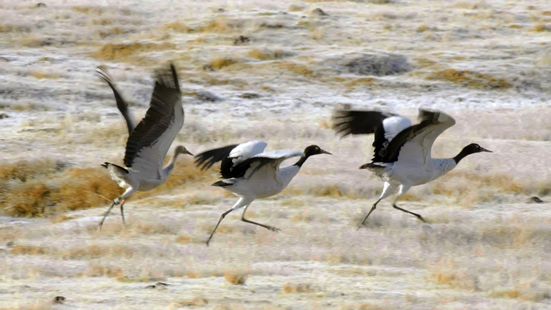 黑頸鶴驅(qū)逐闖入領(lǐng)地的其他鳥類。張景元攝