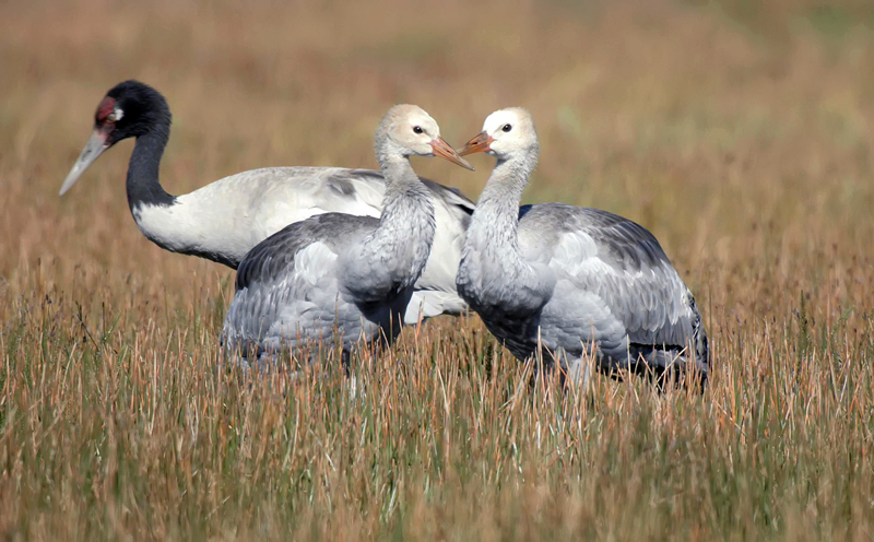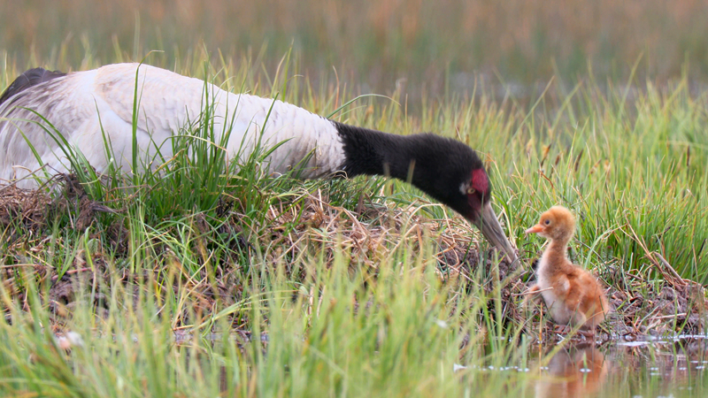 和成鳥一起覓食的黑頸鶴幼雛。張景元攝