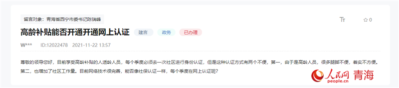近日,來自青海省西寧市的網(wǎng)友W*** 在人民網(wǎng)“領(lǐng)導(dǎo)留言板”留言稱,目前享受高齡補(bǔ)貼的適齡人員每個季度需去一次社區(qū)進(jìn)行身份認(rèn)證,而很多高齡人員腿腳不便,去認(rèn)證不夠方便,其次增加了社區(qū)工作量。目前網(wǎng)絡(luò)技術(shù)很完善,能否像社保認(rèn)證一樣每個季度在網(wǎng)上認(rèn)證。