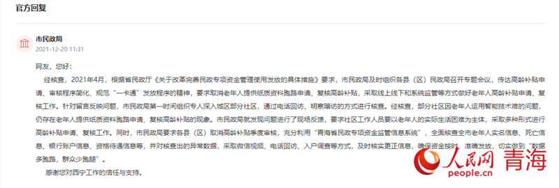 對此,西寧市民政局回復(fù):經(jīng)核查,部分社區(qū)因老年人運(yùn)用智能技術(shù)難的問題,仍存在老年人提供紙質(zhì)資料跑路申請、復(fù)核高齡補(bǔ)貼的現(xiàn)象。西寧市民政局就發(fā)現(xiàn)的問題進(jìn)行了現(xiàn)場反饋,要求社區(qū)工作人員要以老年人的實際生活困難為主體,采取多種形式進(jìn)行高齡補(bǔ)貼申請、復(fù)核工作。同時,西寧市民政局要求各縣(區(qū))取消高齡補(bǔ)貼季度審核,充分利用“青海省民政專項資金監(jiān)管信息系統(tǒng)”,對于需要核查的信息,采取微信視頻、電話回訪、入戶調(diào)查等方式,及時核實更正信息,切實做到“數(shù)據(jù)多跑路,群眾少跑腿”。