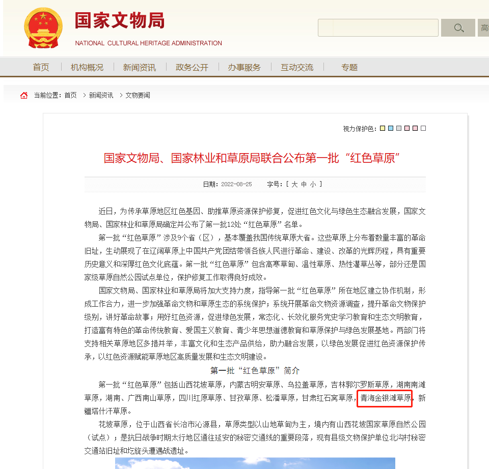 青海金銀灘草原入選第一批“紅色草原”。截圖自國家文物局官網(wǎng)