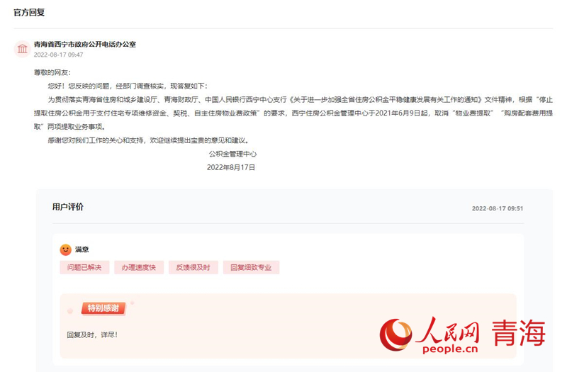 自2021年7月起,人民網(wǎng)“領(lǐng)導(dǎo)留言板”青海版塊陸續(xù)收到數(shù)條網(wǎng)民留言反映,往年西寧市民可通過(guò)“西寧住房公積金管理中心”微信平臺(tái)、青海銀行公積金辦理窗口、西寧住房公積金管理中心辦理窗口等途徑辦理物業(yè)費(fèi)提取業(yè)務(wù),但2021年7月以后卻被告知不能辦理。