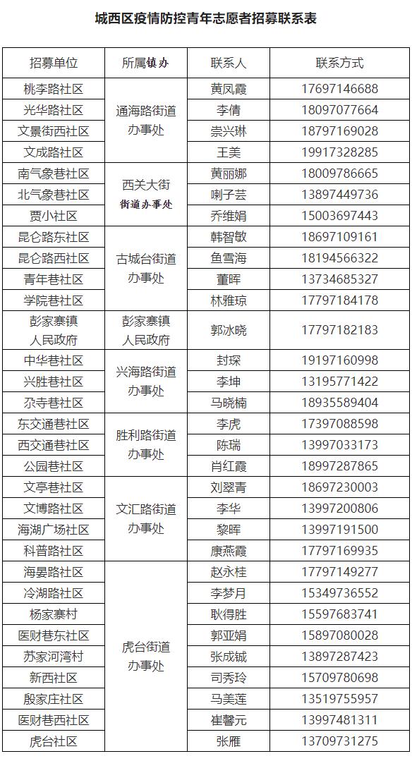 城西區(qū)各社區(qū)聯(lián)系方式匯總。?共青團城西區(qū)委員會供圖(點擊圖片查看招募倡議詳情)