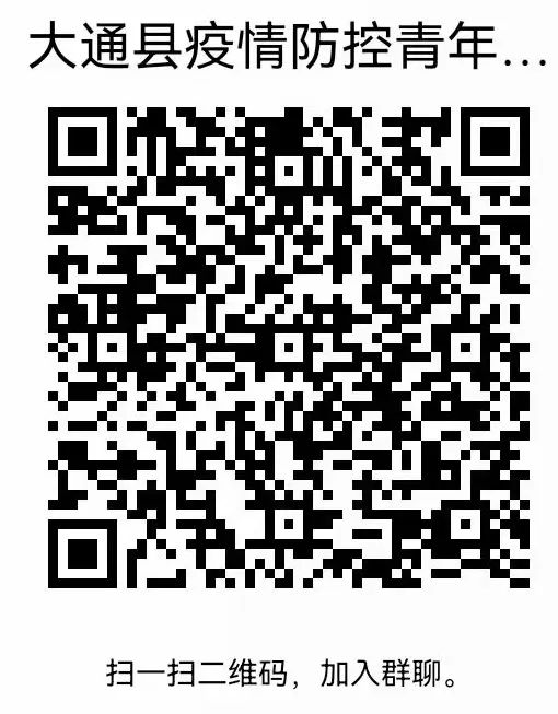掃描下方二維碼填寫報名表,報名成功后,加入大通縣疫情防控青年志愿者儲備QQ群。(①群已滿,可以加入疫情防控志愿者儲備②群:787465752)