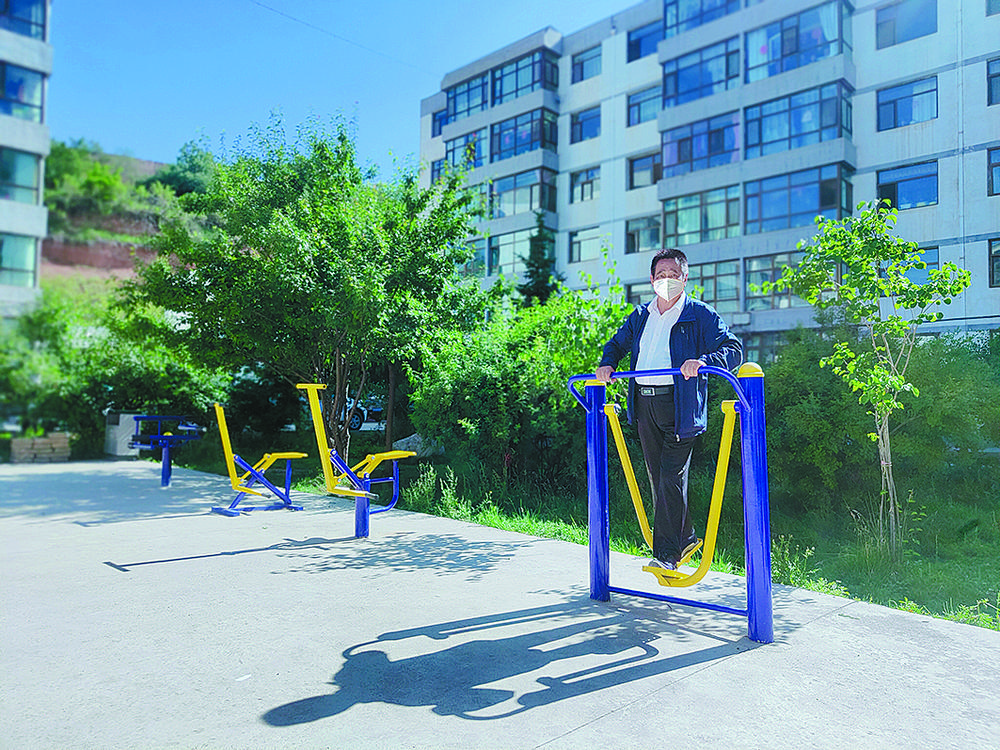 梁成忠正在休閑廣場的健身器材上鍛煉。青海日?qǐng)?bào)記者 賈泓 攝