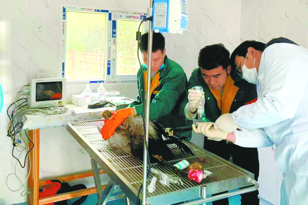 2020年秋季,西寧野生動物園的工作人員在救助落單的黑頸鶴“小灰”。新華社發(fā)(西寧野生動物園供圖)