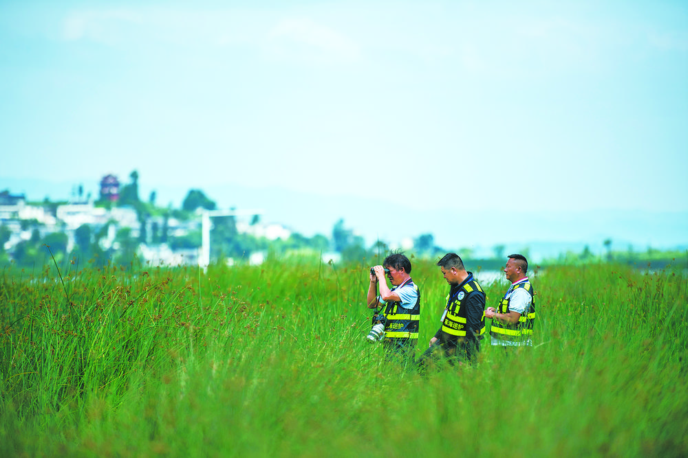 貴州草海國家級自然保護區(qū),草海巡護隊副大隊長劉廣惠(左一)和隊員在日常工作巡護中(2021年7月8日攝)。 新華社記者 陶亮 攝