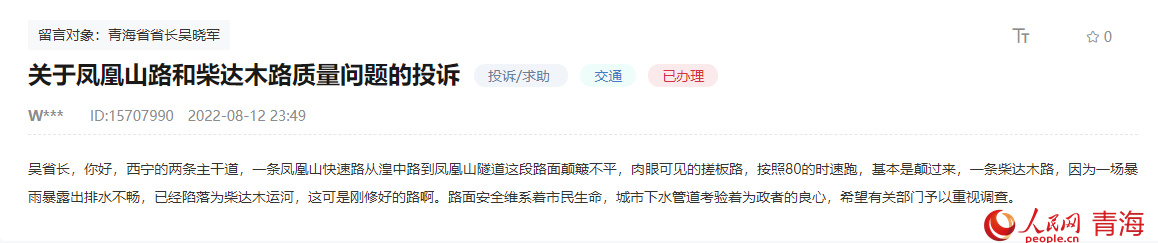 “鳳凰山快速路從湟中路到鳳凰山隧道路面顛簸不平,是肉眼可見的搓板路……”近日,有群眾在人民網(wǎng)“領(lǐng)導(dǎo)留言板”留言反饋西寧市鳳凰山路路面不平,存在安全隱患。