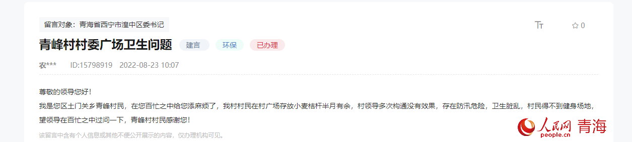 收到留言后,青海省西寧市湟中區(qū)委辦公室于9月5日給出答復(fù):自收到留言后,湟中區(qū)委高度重視,相關(guān)部門立即開始詳細(xì)了解情況。在相關(guān)部門工作人員的及時督促下,青峰村村廣場存放的小麥和秸稈現(xiàn)已全部清理完畢。下一步,湟中區(qū)土門關(guān)鄉(xiāng)人民政府已要求村“兩委”干部對影響村容村貌的現(xiàn)象及時發(fā)現(xiàn)整改,確保鄉(xiāng)村環(huán)境衛(wèi)生整潔。