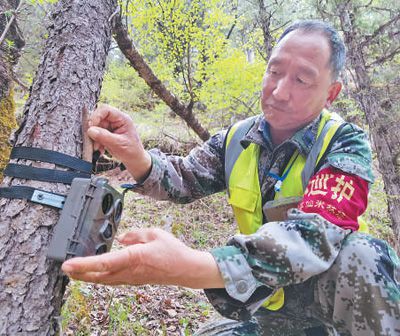 祁連山國家公園寺溝管護(hù)站的生態(tài)管護(hù)員在巡護(hù)途中檢查野外紅外相機(jī)。