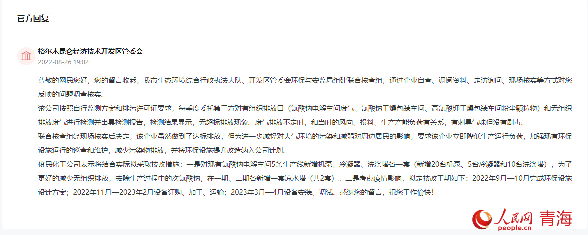 收到留言后,格爾木昆侖經(jīng)濟(jì)技術(shù)開(kāi)發(fā)區(qū)管委會(huì)于8月24日給出回復(fù),稱(chēng)格爾木市生態(tài)環(huán)境綜合行政執(zhí)法大隊(duì)、開(kāi)發(fā)區(qū)管委會(huì)環(huán)保與安監(jiān)局組成聯(lián)合核查組,通過(guò)企業(yè)自查、調(diào)閱資料、走訪詢問(wèn)、現(xiàn)場(chǎng)核實(shí)等方式,發(fā)現(xiàn)該企業(yè)無(wú)超標(biāo)排放現(xiàn)象,但為進(jìn)一步減輕對(duì)大氣環(huán)境的污染和減弱對(duì)周邊居民的影響,聯(lián)合核查組要求該企業(yè)立即降低生產(chǎn)運(yùn)行負(fù)荷,加強(qiáng)現(xiàn)有環(huán)保設(shè)施運(yùn)行的巡查和維護(hù),減少污染物排放,并將環(huán)保設(shè)施提升改造納入公司計(jì)劃。同時(shí),青??∶窕び邢挢?zé)任公司表示,將結(jié)合實(shí)際采取整改措施。