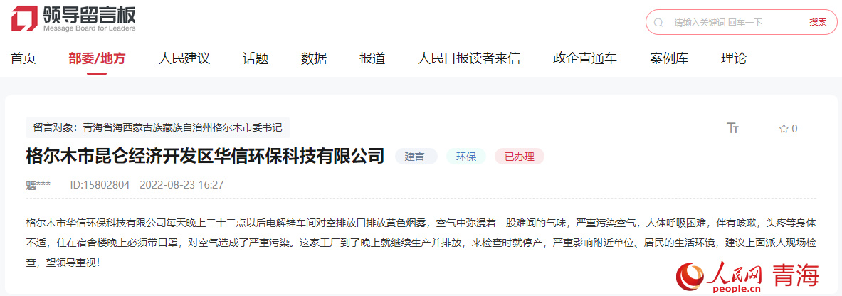 但在8月23日,人民網(wǎng)“領(lǐng)導(dǎo)留言板”收到類(lèi)似情況的留言,該留言稱(chēng),位于海西州格爾木市開(kāi)發(fā)區(qū)的青海華信環(huán)保科技有限公司每天晚上十點(diǎn)以后電解鋅車(chē)間對(duì)空排放口排放黃色煙霧,空氣中彌漫著一股難聞的氣味,嚴(yán)重污染空氣,住在宿舍樓晚上必須戴口罩,嚴(yán)重影響附近單位、居民的生活環(huán)境,希望得到解決。