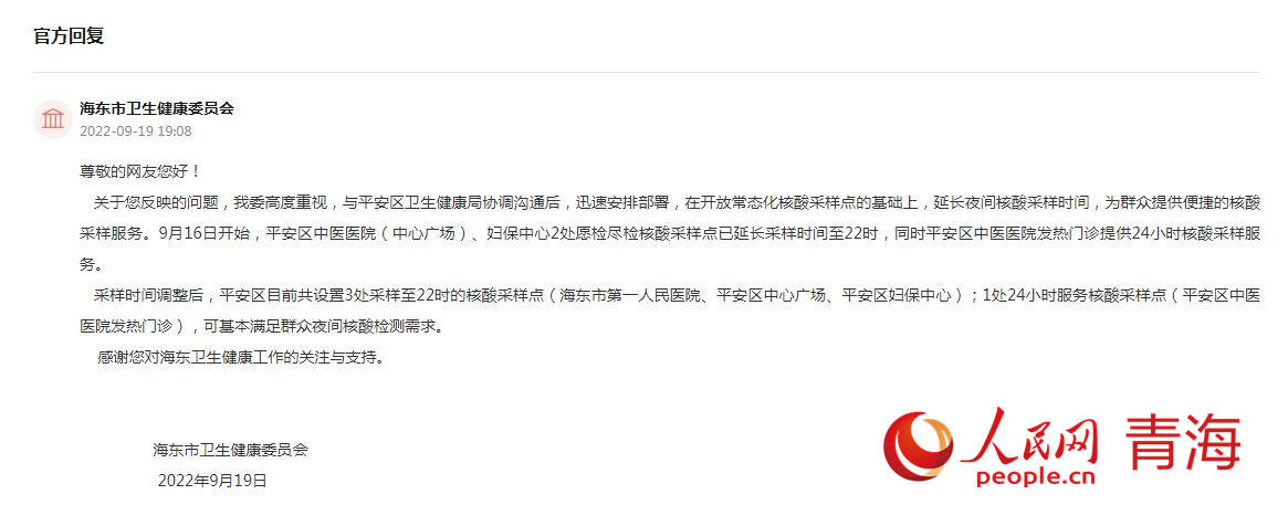 對此,海東市衛(wèi)生健康委員會回復稱:與平安區(qū)衛(wèi)生健康局協(xié)調溝通后,迅速安排部署,在開放常態(tài)化核酸采樣點的基礎上,延長夜間核酸采樣時間,為群眾提供便捷的核酸采樣服務。9月16日開始,平安區(qū)中醫(yī)醫(yī)院(中心廣場)、婦保中心2處愿檢盡檢核酸采樣點已延長采樣時間至22時,同時平安區(qū)中醫(yī)醫(yī)院發(fā)熱門診提供24小時核酸采樣服務。