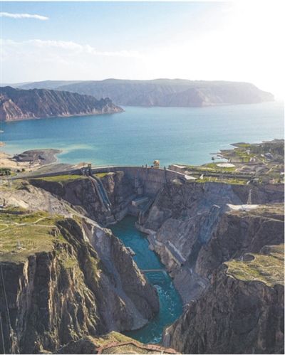 俯瞰龍羊峽水電站。位于青海海南藏族自治州共和縣和貴南縣交界處的龍羊峽水電站,是黃河上游龍青段規(guī)劃的第一座大型梯級水電站。