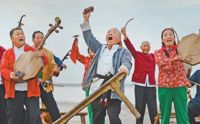 陜西省渭南市潼關(guān)縣,西北綜勘黃河老腔藝術(shù)團藝人在黃河岸邊表演黃河老腔。黃河老腔起源于黃河岸邊,由黃河碼頭船工喊的號子演變而來,歷史悠久。