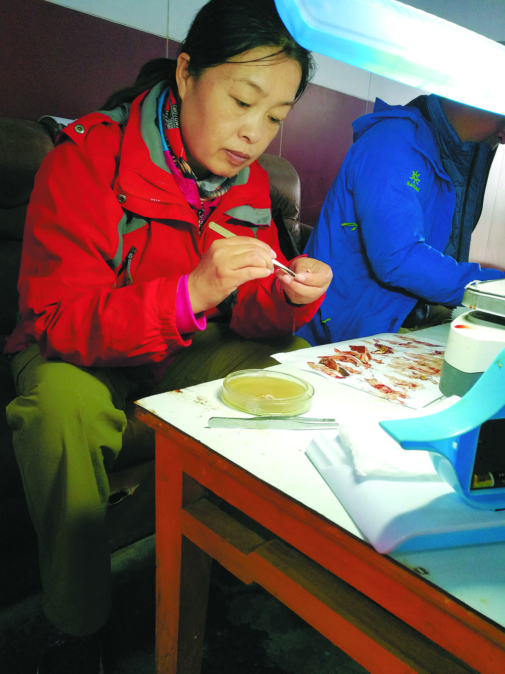 祁洪芳取青海湖裸鯉鱗片,進行年齡鑒定。青海湖裸鯉救護中心供圖