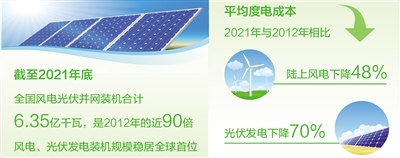 十年來,我國以風電、光伏發(fā)電為代表的新能源發(fā)展成效顯著,風電、光伏發(fā)電裝機規(guī)模穩(wěn)居全球首位。2021年新能源發(fā)電量約1.15萬億千瓦時,基本相當于當年全國居民生活用電量。