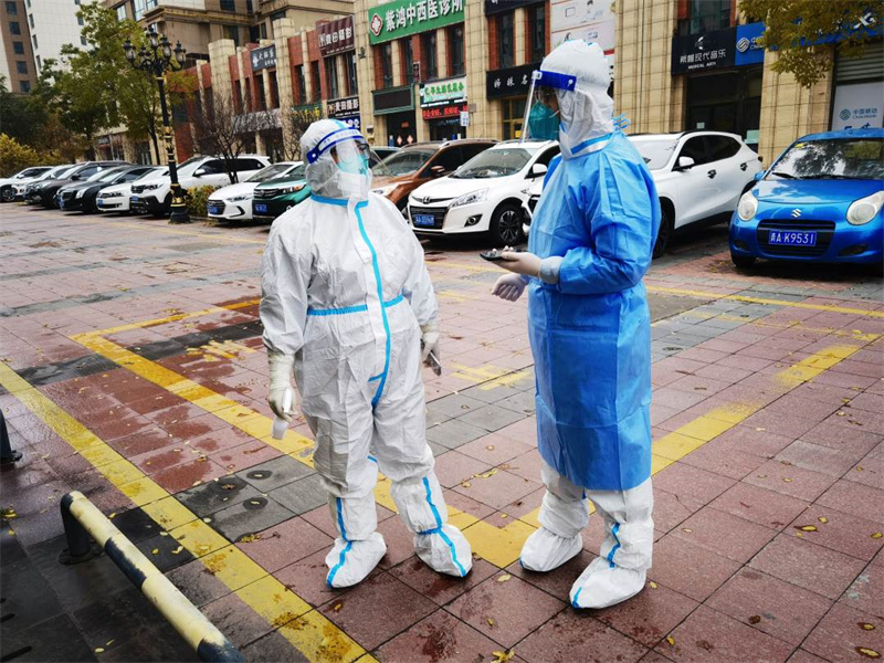 穿好防護(hù)服,戴好口罩,完成消殺,穿過一堵綠色鐵皮圍成的隔離圍擋,我們跟著王艷平走到了盛世華城小區(qū)內(nèi)部。超市、飯店、銀行、藥店、診所……緊閉的店門和陰郁的天空讓本就神經(jīng)緊繃的我們更加緊張——被劃為高風(fēng)險區(qū)域的幾棟樓離我們僅有十幾米的距離。